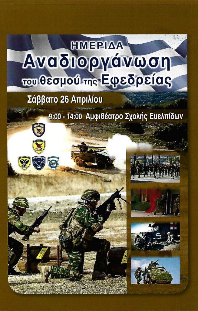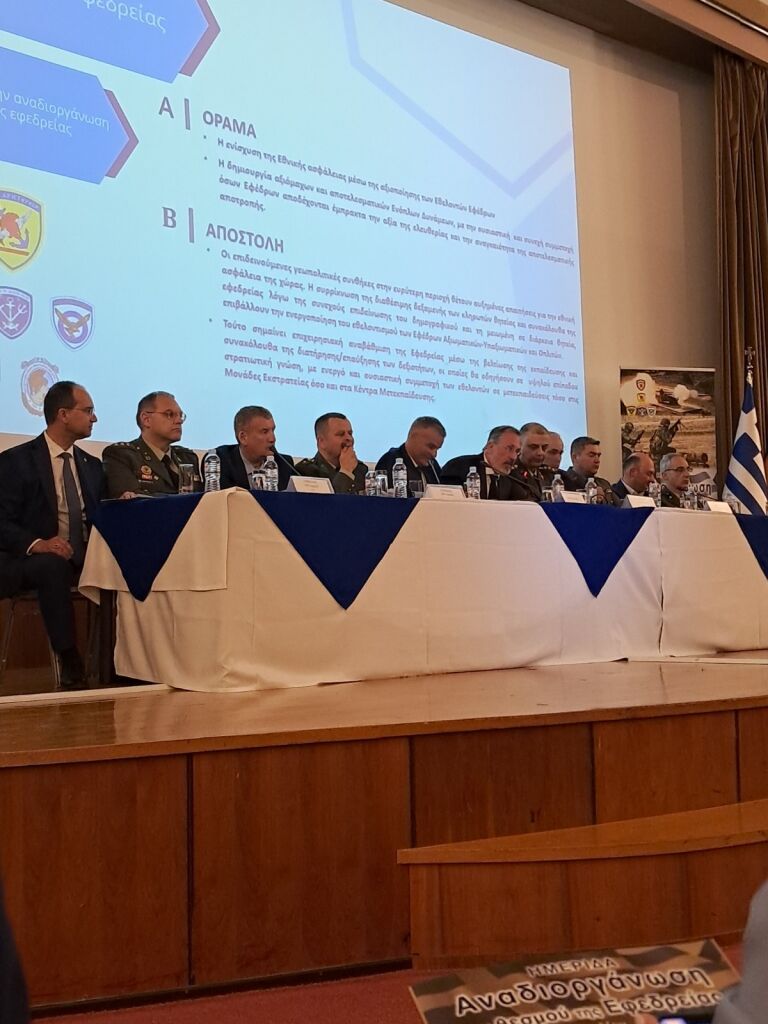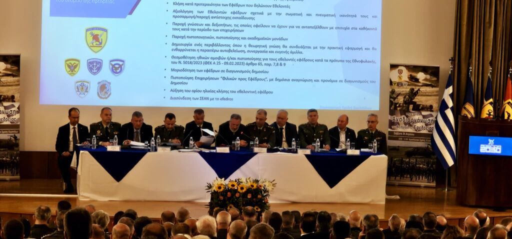 0Με στόχο την μεταρρύθμιση και τον εκσυγχρονισμό του θεσμού της εφεδρείας ώστε να ενταχθεί ισότιμα στην «Ατζέντα 2030», έκλεισε τις εργασίες της η ημερίδα για την Αναδιοργάνωση της Εφεδρείας στο Αμφιθέατρο της ΣΣΕ την 26-04-2025, παρουσία του Αρχηγού του ΓΕΣ Αντιστράτηγου Γεώργιου Κωστίδη, Ανωτέρων και Ανωτάτων Αξιωματικών του Στρατού, της Αεροπορίας και του Ναυτικού, Εφέδρων Αξιωματικών απ’ όλη την Ελλάδα, μελών των ΣΥΝΔΕΣΜΩΝ ΕΦΕΔΡΩΝ ΑΞΙΩΜΑΤΙΚΩΝ (ΣΕΑΝ), του Εφέδρου Ανθυπολοχαγού Νικόλαου Δένδια, Υπουργού Εθνικής Άμυνας, αλλά και του Εφέδρου Ανθυπολοχαγού, Μητροπολίτη Περιστερίου κκ Γρηγόριου, όπως εύστοχα σημείωσε κατά την προσφώνησή του ο Πρόεδρος της ΑΠΟΕΑ Δρ. Φίλιππος Κωσταράς.