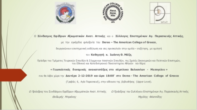 Ο Σύνδεσμος Εφέδρων Αξιωματικών Αν. Αττικής σε συνεργασία με τον Σύλλογο Επιστημόνων Αγ.Παρασκευής Αττικής, με την εγκάρδια φιλοξενία του Deree – The American College of Greece, διοργανώνουν επιστημονική εκδήλωση και σας προσκαλούν στην ομιλία – συζήτηση με ομιλητή τον Καθηγητή κ.Ιωάννη Μάζη, Πρόεδρο του Τμήματος Τουρκικών Σπουδών και Σύγχρονων Ασιατικών Σπουδών, της Σχολής Οικονομικών και Πολιτικών Επιστημών, του Εθνικού και Καποδιστριακού Πανεπιστημίου Αθηνών, με θέμα: “Γεωπολιτικές δυναμικές ανακατατάξεις στο σύμπλοκο Βαλκανίων – Μεσογείου”, την ΔΕΥΤΕΡΑ 2-12-2019 και ώρα 18.00΄στο Deree – The American College of Greece (Γραβιάς 6, Αγ.Παρασκευή), στην αίθουσα της Βιβλιοθήκης (Upper Level).