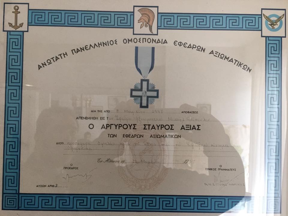 Ομιλία με θέμα το “Το Εικοσιένα και η Ελληνική Ζωή” οργάνωσε το πρωί της Κυριακής 23-3-1997 στην αίθουσα Τερζάκη, ο Σύνδεσμος μας με ομιλητή τον Καθηγητή της Φιλοσοφικής Σχολής του Πανεπιστημίου Αθηνών και Πρόεδρο της ΑΠΟΕΑ κ.Γρ.Κωσταρά. Μετά την ομιλία το Προεδρείο της ΑΠΟΕΑ απένειμε τον “ΑΡΓΥΡΟ ΣΤΑΥΡΟ” στον Πρόεδρο μας κ. Μιχαήλ Γατόπουλο, πολεμιστή του ’40. Το Μετάλλιο αυτό είναι το 3ο που απονέμεται μετά τον πρώην Πρόεδρο της Δημοκρατίας κ.Στασινόπουλο και τον Ποιητή Ο.Ελύτη. Ο Πρόεδρος Μ.Γατόπουλος έχει τιμηθεί με άλλα 4 πολεμικά μετάλλια.