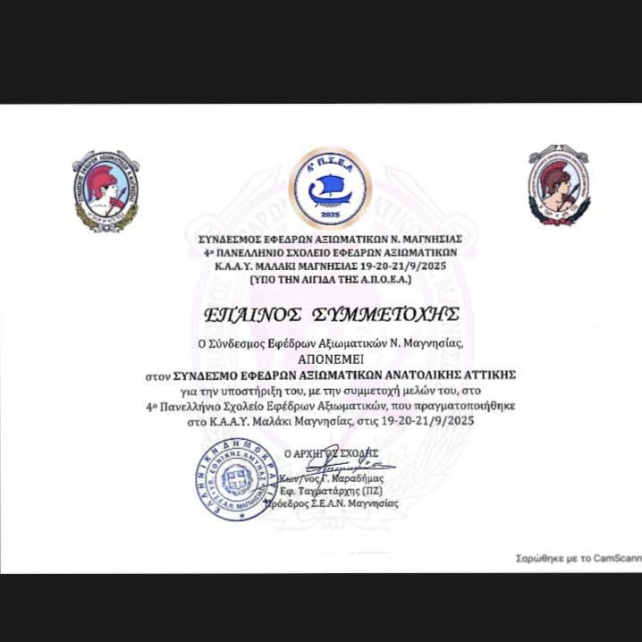 Στις 19-20-21 Σεπτεμβρίου 2025 πραγματοποιήθηκε με μεγάλη επιτυχία το 4ο Πανελλήνιο Σχολείο Εφέδρων Αξιωματικών στις εγκαταστάσεις του Κ.Α.Α.Υ. Μαλάκι Μαγνησίας. Το 4ο ΠΣΕΑ διοργάνωσε ο ΣΕΑΝ Μαγνησίας και συμμετείχαν 60 Έφεδροι Αξιωματικοί από 15 ΣΕΑΝ της χώρας. Το εν λόγω σχολείο ήταν υπό την αιγίδα της Ανώτατης Πανελλήνιας Ομοσπονδίας Εφέδρων Αξιωματικών και το παρακολούθησαν από κοντά ο Πρόεδρος της ΑΠΟΕΑ κ. Φίλιππος Κωσταράς και ο Γενικός Γραμματέας κ. Θρασύβουλος Λαδόπουλος.