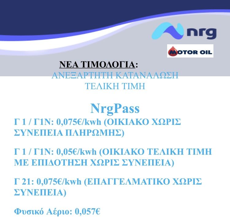 ΝΕΑ ΤΙΜΟΛΟΓΙΑ ΑΠΟΚΛΕΙΣΤΙΚΑ ΓΙΑ ΤΟΥΣ ΕΦΕΔΡΟΥΣ ΑΞΙΩΜΑΤΙΚΟΥΣ: ΑΝΕΞΑΡΤΗΤΗ ΚΑΤΑΝΑΛΩΣΗ ΤΕΛΙΚΗ ΤΙΜΗ NrgPass Γ 1 / Γ1Ν: 0,075€/kwh (ΟΙΚΙΑΚΟ ΧΩΡΙΣ ΣΥΝΕΠΕΙΑ ΠΛΗΡΩΜΗΣ) Γ 1 / Γ1Ν: 0,05€/kwh (ΟΙΚΙΑΚΟ[…]