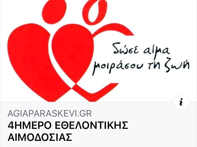 4ΗΜΕΡΟ ΕΘΕΛΟΝΤΙΚΗΣ ΑΙΜΟΔΟΣΙΑΣ Ο Δήμος Αγίας Παρασκευής πραγματοποιεί 4ήμερο ΕΘΕΛΟΝΤΙΚΗΣ ΑΙΜΟΔΟΣΙΑΣ στις 27, 28, 29 Απριλίου και 5 Μαΐου από τις 9:00 έως 12:30, στην αίθουσα του Δημοτικού Συμβουλίου του[…]