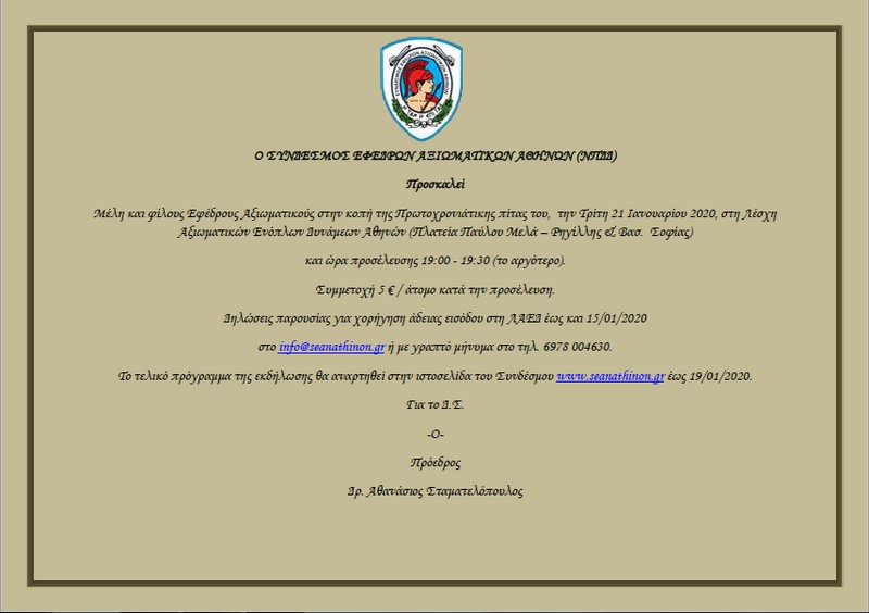 Με μεγάλη επιτυχία πραγματοποιήθηκε το Σάββατο 15-2-2020 στο μέγαρο της Παλαιάς Βουλής, η εκδήλωση του Συνδέσμου Εφέδρων Αξιωματικών Αθηνών και των Αποστράτων Aξιωματικών Ιππικού – Τεθωρακισμένων για την Επέτειο των[…]